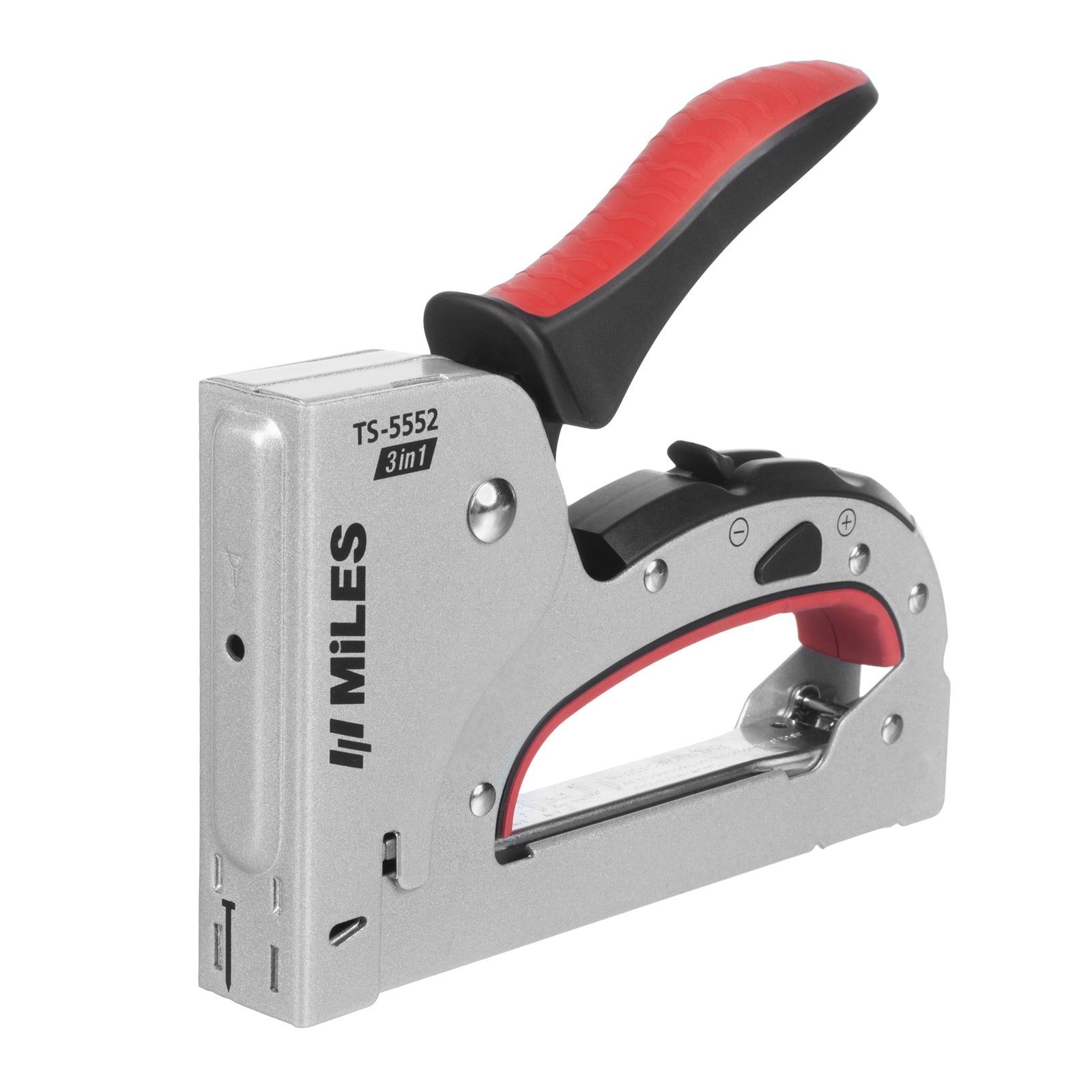 Скобозабивной степлер 3в1 Miles TS-5552 применяется для обивочных работ, сборки мебели, багетных работ и прочего. Предусмотрена регулировка силы удара в зависимости от плотности материала. Модель очень удобна в использовании благодаря прорезиненной вставке на рукоятке.