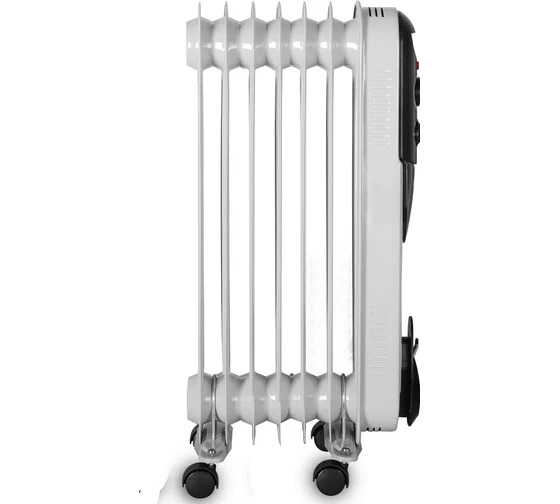 Eurolux ОМПТ-EU-7Н - модель 7-секционного масляного обогревателя предназначена для комфортного обогрева помещения до 20 м2, а также может быть использована в качестве дополнительного источника тепла на более просторных площадях. Прибор функционирует посредством нагрева до высокой температуры минерального масла, залитого внутрь корпуса. Нагревательный элемент – ТЭН. Мощность этого масляного обогревателя составляет 1.5 кВт. При этом он может работать в трёх режимах нагрева: 1 – 600 Вт, 2 – 900 Вт и 3 – 1500 Вт. Прибор работает под управлением термостата. К преимуществам модели важно отнести наличие длинного шнура питания, позволяющего размещать прибор в удобном месте помещения. Удобство ещё и в том, что для хранения шнура на корпусе предусмотрен кронштейн для намотки шнура с фиксатором для вилки. Для перемещения и транспортировки обогревателя в основную комплектацию входят ручки и кронштейны с колёсиками. Вес агрегата – 6 кг. Питание от бытовой электросети – 220 В, 50 Гц.