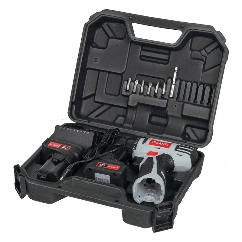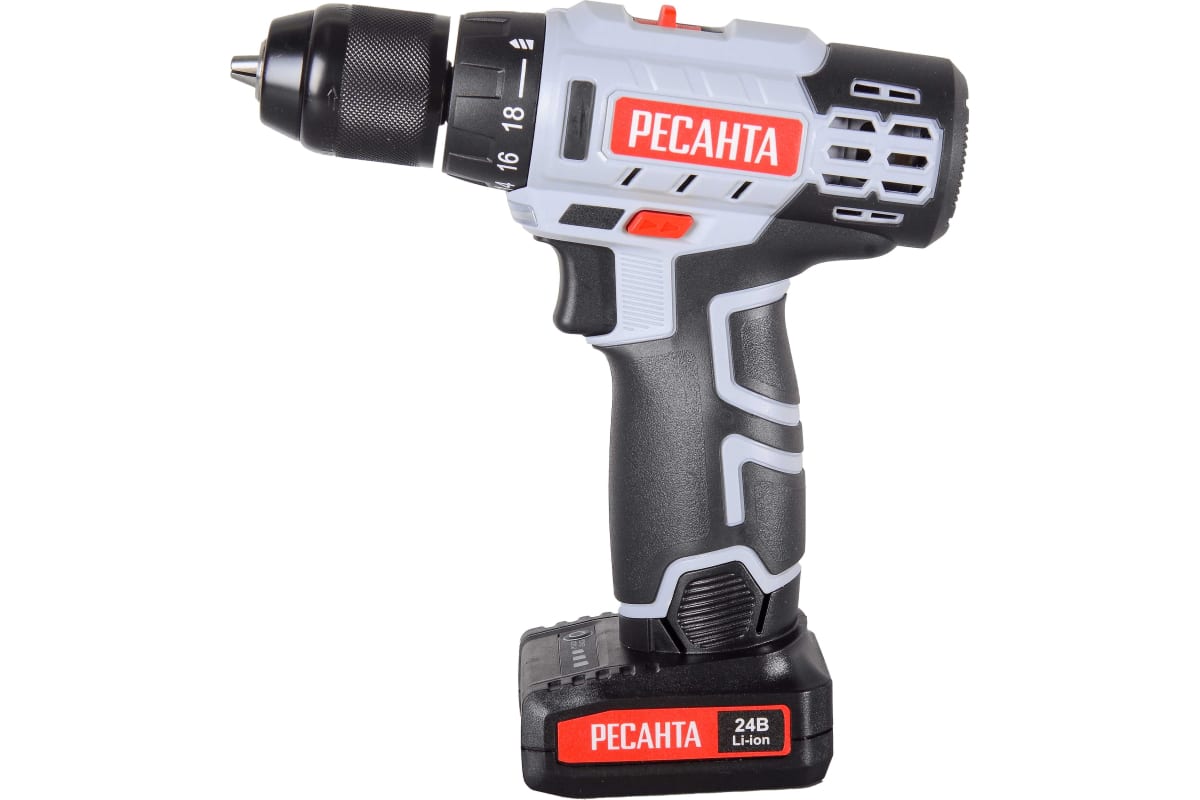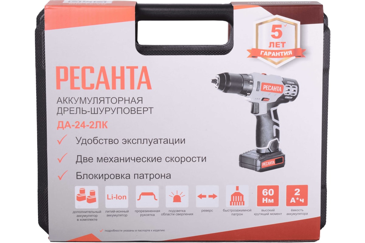Дрель-шуруповерт аккумуляторная ДА-24-2ЛК Ресанта – незаменимый помощник мастера в ремонте или строительстве. Электроинструмент является аналогом модели ДА-24Л-2, отличие: есть кейс и второй аккумулятор. Прибор аккуратно сверлит отверстия на поверхностях из дерева и металла, а также накрепко закручивает шурупы. В комплект к дрели-шуруповерту поставляется удобный кейс, в котором можно хранить инструмент, зарядку к нему и другие рабочие детали. Не требует подключения к сети, что позволяет использовать ее в помещениях, где нет доступа к системе электропитания. Рабочие элементы легко заменить благодаря быстрозажимному патрону. Для ослабления креплений и выкручивания шурупов есть обратный ход. Форма рукоятки удобная, с резиновыми вставками, не скользит в руке. Система охлаждения мотора за счет вентиляционных отверстий на корпусе. Щёточный двигатель, две скорости (0-400 об/мин и 0-1400 об/мин). Модель работает от надёжного литий-ионного аккумулятора (Li-Ion).
