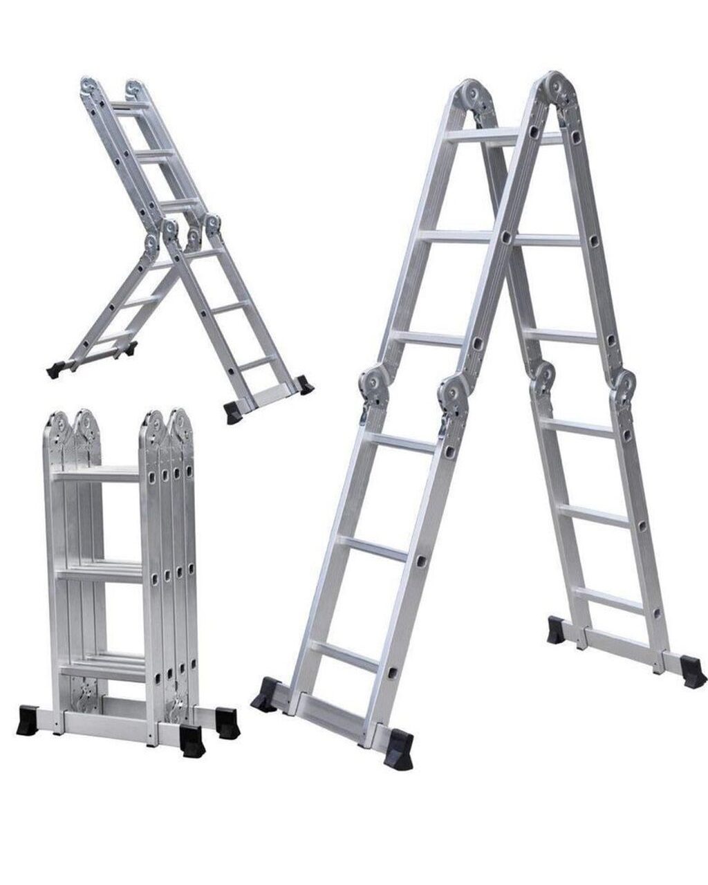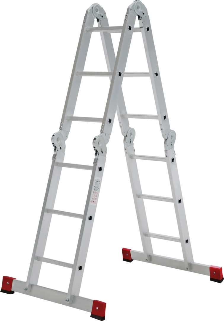 Алюминиевая лестница-трансформер состоит из четырех секций с тремя ступеньками в каждой. Лестница отличается широким набором возможностей установки, устойчивостью и долговечностью.