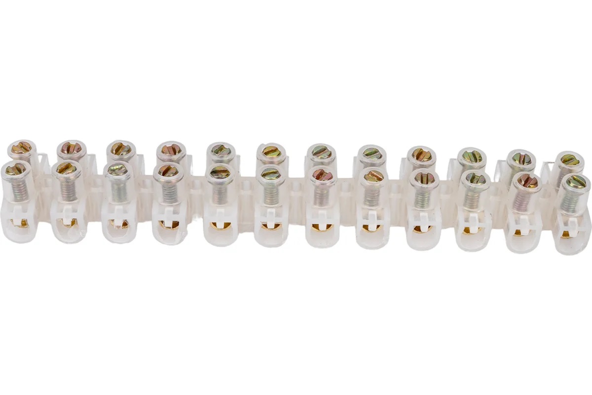 Применяются для винтового соединения проводников, защищая провод от повреждения и исключая возможность замыкания на корпус электроустановки. Изоляционный каркас изготовлен из белого негорючего полистирола, клемма и винты – латунь.