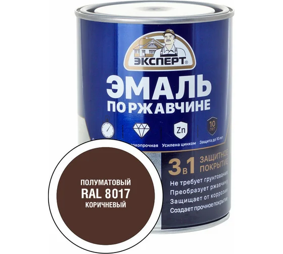 Эмаль ЭКСПЕРТ по ржавчине 3 в 1 применяется для защитно-декоративного окрашивания металлических, деревянных, бетонных и железобетонных конструкций без предварительного грунтования. Состав объединяет свойства 3 продуктов: преобразователя ржавчины, антикоррозионного грунта и декоративной эмали. Используют для внутренних и наружных работ. Преимущества: Для наружных и внутренних работ. Краска создана по формуле 3 в 1 (преобразователь ржавчины, грунтовка и декоративное финишное покрытие). Можно наносить прямо на ржавчину. Обладает хорошей укрывистостью. Преобразует ржавчину в прочный защитный слой. Препятствует дальнейшей коррозии. Образует атмосферостойкое покрытие. Усилена цинком. Быстросохнущая. Легкое нанесение (хорошо растекается). Защита металла до 10 лет.