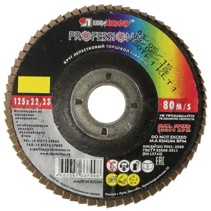 Круг лепестковый торцевой плоский КЛТ1 Луга предназначен для ручных шлифовальных машин. Применяется для плоского шлифования, обработки кромок и сварных швов деталей и конструкций из различных марок сталей, цветных металлов и древесины. Круг работает тихо, устойчиво, без прижогов, оставляя холодными обработанные поверхности, обеспечивает максимальный съем материала.
