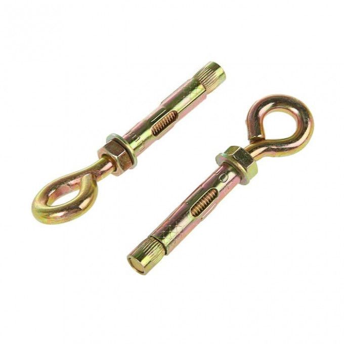 На конце болта расположено кольцо. При монтаже оно служит опорой для вертикально закрепляемого груза. Метод, как установить анкерный болт с кольцом, не отличается от технологии монтажа предыдущих видов крепежа. Анкер устанавливается в просверленное монтажное отверстие. При закручивании стержня втулка распирается и надежно фиксируется в теле материала.
