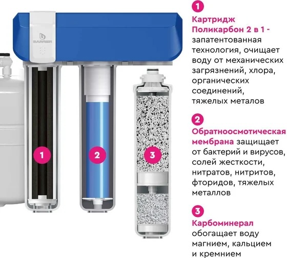 Фильтр обратного осмоса Барьер «COMPACT OSMO 100М» быстросъемный Н262Р02 - компактное стильное решение для кухни, трехступенчатая обратноосмотическая система с минерализатором БАРЬЕР по эффективности, соответствует классическому 5-ти ступенчатому осмосу. УНИКАЛЬНЫЙ КРАН НА ДВЕ ВОДЫ в комплекте. Два вида воды из одного крана: осмотическая – для приготовления еды, для бытовых приборов и минерализованная – для питья. Этапы очистки: 1 ступень: Compact Поликарбон 2 в 1 - Запатентованная технология, максимальная эффективность очистки от различных частиц до 5мкм, хлора, органических соединений, ионов тяжелых металлов и неприятных запахов и привкусов. Ресурс: 5000л. Рекомендуемая частота замены – 6 мес. 2 ступень: Compact RO 100 – 100 галлонная мембрана пропускает только молекулы воды, задерживая все возможные примеси. Ресурс: 5000л. Рекомендуемая частота замены – 18 мес. 3 ступень: Compact Карбоминерал– возвращает воду к физиологически полноценному состоянию после очистки обратным осмосом. Обогащает воду полезными для здоровья минералами: Магний – поддерживает иммунитет, уменьшает уровень стресса, улучшает сон. Кальций – способствует формированию костей, регулирует сердечный ритм, поддерживает обменные процессы в организме. Кремний – предупреждает появление сосудистых заболеваний, оказывает иммуностимулирующее действие. Ресурс: 5000л. Рекомендуемая частота замены – 6 мес. Ресурс картриджей зависит от качества исходной воды.
