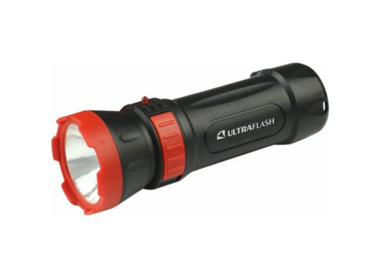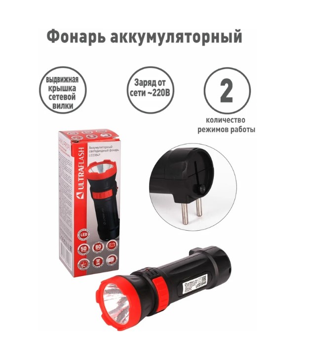 Фонарь Ultraflash LED3849 — электрический светодиодный аккумуляторный фонарь чёрного цвета. Некоторые характеристики: источник света — 1 светодиод с индивидуальным отражателем со световым потоком 80 люмен; дистанция освещения — 50–100 метров; два режима работы; выключатель — тумблер; время работы при полностью заряженном аккумуляторе — 3–4 часа; заряд напрямую от сети ~220 вольт, время заряда — 5 часов; степень пыле-влаго-защиты — IPX4; гарантийный срок — 1 год. Комплектация: свинцово-кислотный аккумулятор с напряжением 4 В ёмкостью 0,3 А-ч, светодиодный индикатор заряда, выдвижная сетевая вилка. Размеры: максимальный линейный размер фонаря — 12,2 см, размер упаковки — 4,25 см x 12,5 см x 4,25 см. 13 Вес: без упаковки — 0,076 кг, с упаковкой — 0,093 кг.