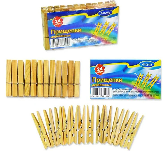 Деревянные прищепки ANTELLA 24 шт 71056 предназначены для закрепления белья и других текстильных изделий на шнуре для их просушивания. Изготовлены из прочного материала, за счет чего устойчивы к механическому воздействию.