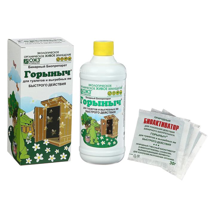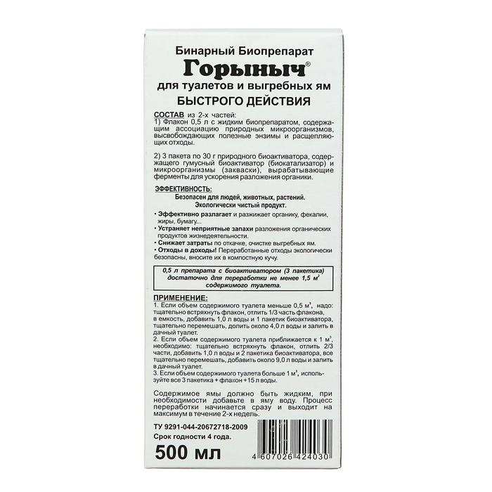 Расход биопрепарата «Горыныч» зависит от объёма содержимого туалета: если объём меньше 0,5 м³, то нужно: тщательно встряхнуть флакон, отлить 1/3 часть; добавить 1 л воды и 1 пакетик биоактиватора; тщательно перемешать, долить 4 л воды и залить в дачный туалет. Если объём составляет около 1 м³, то нужно: встряхнуть флакон, отлить 2/3 содержимого; добавить 1 л воды и 2 пакетика биоактиватора; тщательно перемешать, добавить 9 л воды и залить в дачный туалет. Если объём больше 1 м³, то нужно использовать все 3 пакетика, флакон и 15 л воды. Содержимое ямы должно быть жидким, при необходимости нужно добавить воду.