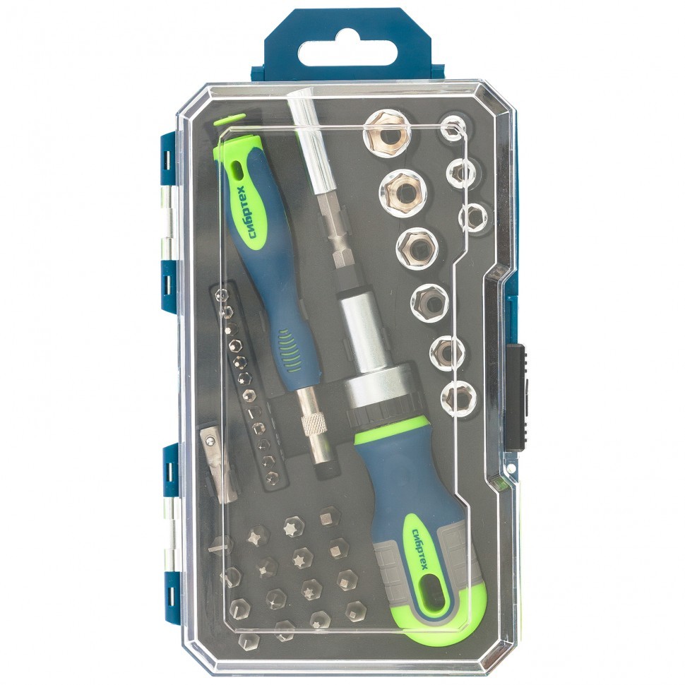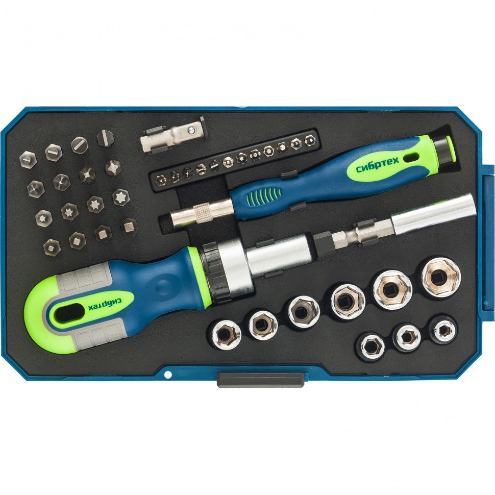 Реверсивные отвертки с набором бит и торцевых головок Сибртех 13338, 41 предмет, CrV, включает в себя насадки для работы с крепежом типа SL, PH, PZ, HEX, TORX и торцевые головки для монтажа/демонтажа гаек, болтов, саморезов. Также в нем есть отвертка и биты для точных работ, с помощью которых можно осуществить ремонт мелкой электроники, очков, детских игрушек и т.д. Удлинитель позволяет проводить работы в труднодоступных местах.