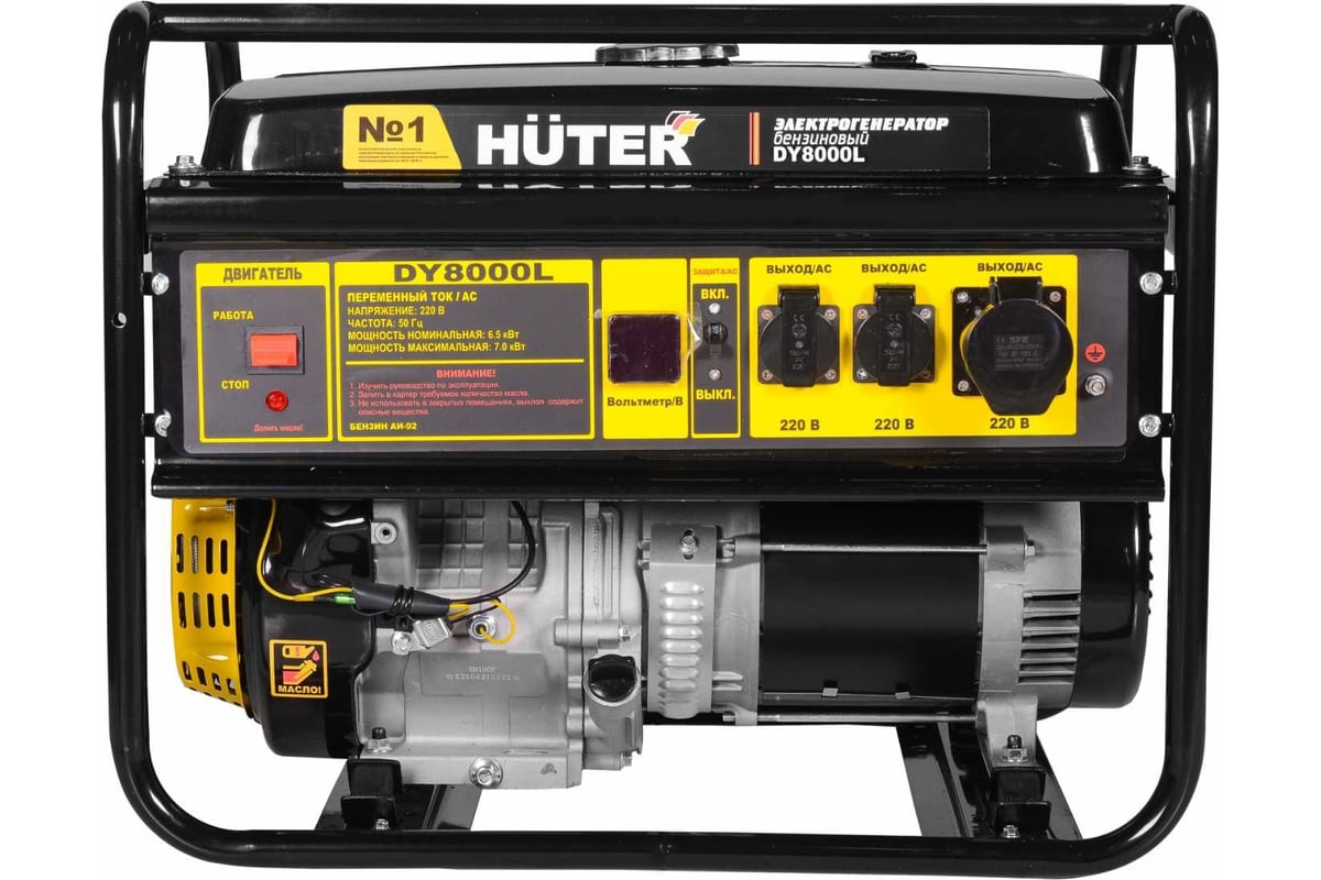 Бензиновый генератор Huter DY8000L – портативная компактная электростанция, обеспечивающая электроснабжение бытовой техники и профессионального оборудования, питающегося от стандартной однофазной сети 220 Вольт. Это самый выгодный бензиновый электрогенератор, с оптимальными техническими характеристиками и низким расходом топлива. Модель Huter DY8000L может использоваться в качестве резервного источника питания для частных домов и квартир, а также как постоянная станция, обеспечивающая работу электроприборов в полевых условиях.Генерирующая установка имеет синхронный тип устройства и щёточный механизм.В компоновке генератора Хутер 8000 предусмотрена система стабилизации рабочего тока, что формирует чистую синусоиду и как результат – стабильную частоту тока. Это важно при резервном электроснабжении домов, с наличием чувствительной к перепадам климатической техники и компьютерного оснащения.