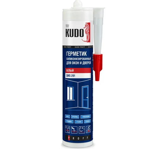 Силиконизированный герметик для окон и дверей KUDO PROFF (белый; 280 мл) SMS-291 предназначен для герметизации швов и стыков откосов, рам, подоконников при установке оконных и дверных блоков из ПВХ и дерева. После отверждения образует долговечный водостойкий шов, не выцветает и не собирает пыль, устойчив к образованию плесени, воздействию большинства моющих и чистящих средств, УФ‑излучению, атмосферным воздействиям и температурным перепадам. После высыхания плёнка герметика образует глянцевую поверхность. Не содержит растворителей, безопасен для окружающей среды, можно окрашивать. Преимущества: - Для внутренних и наружных работ - Имеет широкий температурный диапазон эксплуатации: от –40°С до +70°С - Время высыхания — 2 часа при температуре 20±2°C и относительной влажности воздуха 60±5% при толщине слоя 1 мм, полная прочность достигается через 48 часов Применение: - Работы производить при температуре не ниже +7°С, относительной влажности воздуха не более 80%, температура герметика должна составл