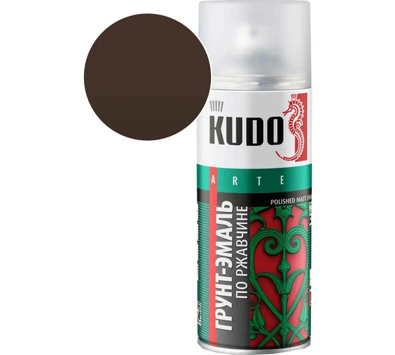 Грунт-эмаль аэрозоль по ржавчине KUDO предназначена для окрашивания изделий из сплавов чёрных металлов, которые подвержены коррозии и уже заржавели. Продукт сочетает в себе свойства нейтрализатора коррозии, грунта и декоративной эмали, что позволяет значительно сократить время для получения покрытия.