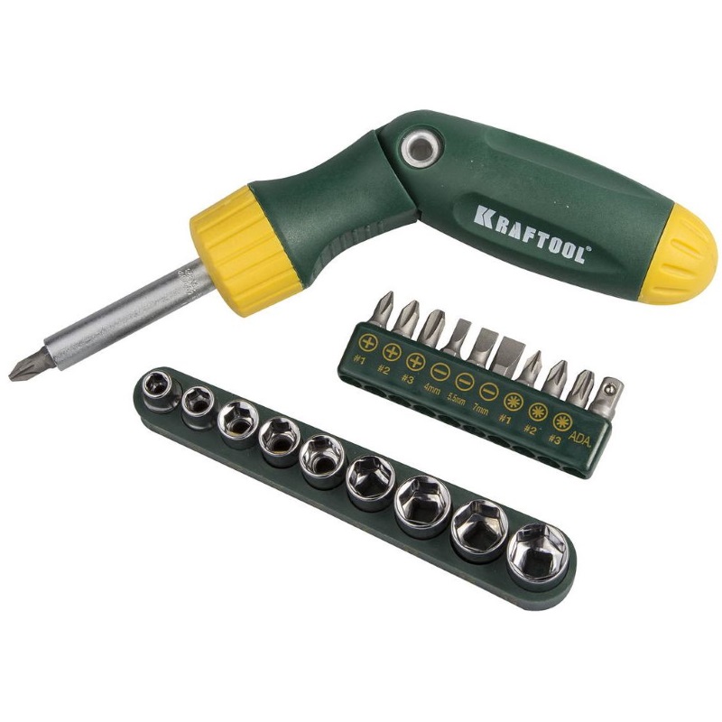 Реверсная рычажная отвертка KRAFTOOLBIT-LOCK 26151-H21 применяется для крепежных работ. За счет наличия реверсивного механизма можно закручивать и выкручивать болты, не отрывая биты от головки крепежного элемента. Поворотный шарнир используется при изменении положения ручки для эффективной передачи усилия при работе.Отвертка комплектуется адаптером для головок 1/4", торцевыми головками (9 шт) и битами (10 шт).