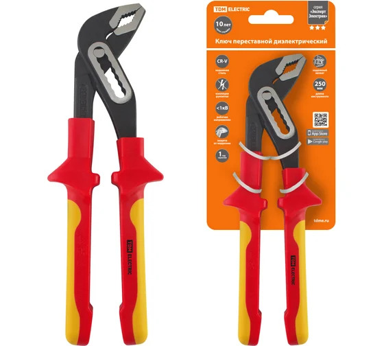 Переставной диэлектрический ключ TDM ЭкспертЭлектрик, 250 мм, 1000 В, CR-V SQ1010-0109 используется для выполнение любых слесарных, электромонтажных и прочих работ, в том числе и под напряжением до 1000 В. Ключ подходит для захвата, фиксации, опрессовки и гибки деталей. Прилегание происходит без зазоров по всей поверхности. Также ключ обеспечивает отсутствие повреждений огранки головок винтов из чувствительных, мягких материалов за счёт развода губок по размеру детали. Конструкцией исключено случайное изменение установки захватных губок и проскальзывание шарнира. Ступенчатый шарнирный механизм даёт возможность для установки нужного размера ключа в рабочем диапазоне за счёт параллельного хода губок и зазора между захватными плоскостями, позволяя быстро закручивать и откручивать винтовые соединения по принципу трещоточного ключа. Инструмент выполнен из высококачественной стали высокой прочности. Кромка и зубья для фиксирующего захвата закалены токами высокой частоты. Специальное покрытие защищает от коррозии.