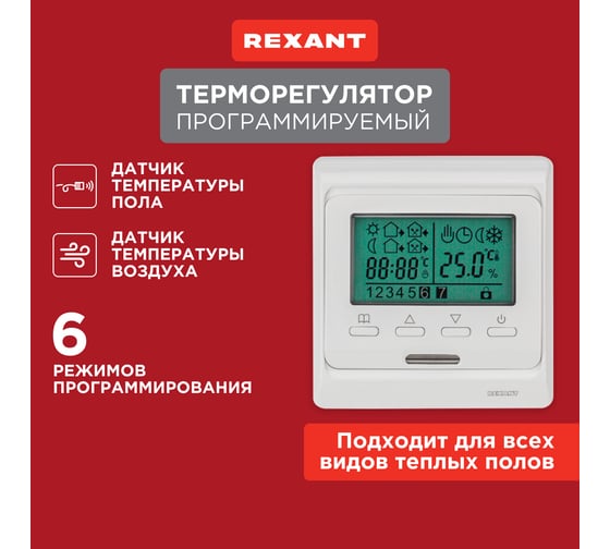 Программируемый терморегулятор R51XT REXANT с выносным датчиком температуры пола предназначен для использования с различными системами напольного обогрева, такими как тёплые полы на основе резистивных кабелей, матов и инфракрасных плёнок.
