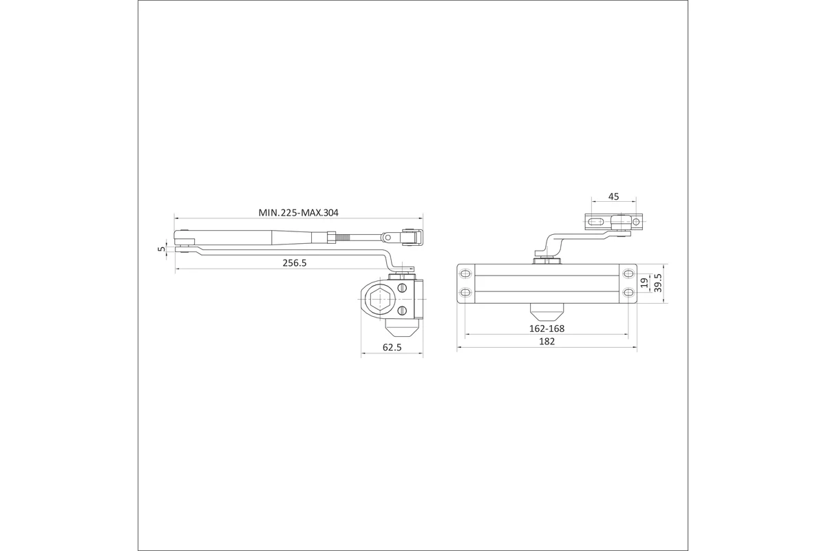 Комплект поставки: -Дверной доводчик -Рычаг складной -Крепеж -Инструкция по монтажу и эксплуатации, совмещенная с паспортом изделия. -Шаблон (М 1:1) для установки.