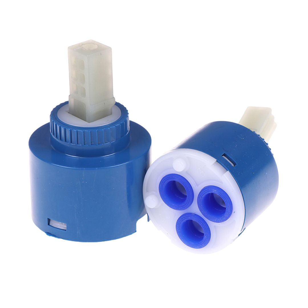 КартриджD40 имеет диаметр отверстий 40 мм и предназначен для рычажных смесителей. Рукоятка приводит в действие внутренний механизм картриджа, который пропускает воду из отверстий для холодной и горячей воды, а также смешивает ее, давая на выходе теплый поток.