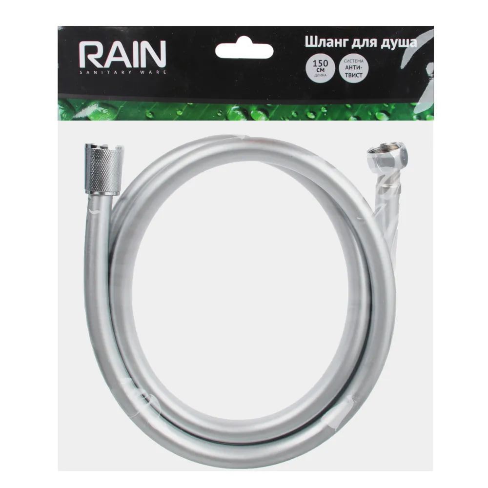 Шланг для душа, 150см, 1/2"(Имп)-1/2"(Имп), антитвист, серебристый RAIN /569-035 Шланг для душа RAIN с конструкций анти-твист - не перекручивается, когда вы принимаете душ. Втулки из латуни - не окисляются и служат долго. Черного цвета - подходит для ванных и душевых с белым и черным кафелем. Размер соединения 1/2 - подходит для труб диаметром 15 мм. Импортный смеситель-импортная лейка.