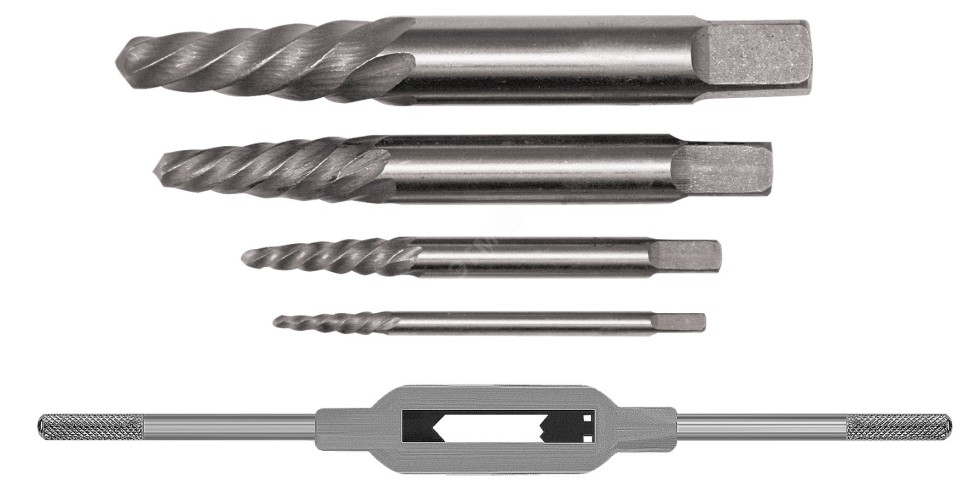 Набор экстракторов «Профи» из быстрорежущей (HSS) стали, состоящий из 4 штук, предназначен для извлечения шурупов и болтов с заломанными (сорванными) шлицами.