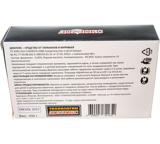 Борные крошки от тараканов и муравьёв Дохлокс 100 г 22009 размещаются на подоконниках, полу, плинтусах, в сантехнических шкафах. Являются сухими пищевыми приманками с повышенным содержанием яда. Наиболее удобны для поедания насекомыми. Упакованы в удобную для использования коробку.