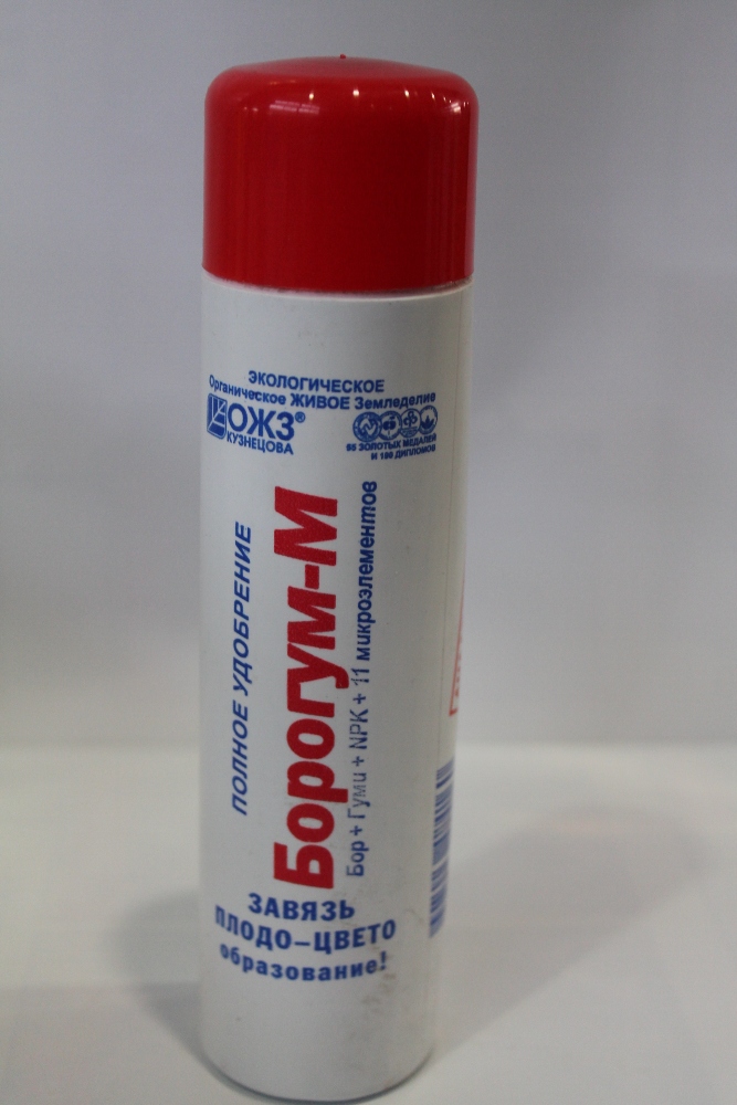 Государственная регистрация- №016-13-4034-1 от 16.03.23 до 15.03.33 выдана МСХ РФ, Сертификация- декларация №РОСС RU Д-RU.РА.01.В.14113/22 от 21.04.22 до 20.04.25 выдана Заявитель: ООО "Башинком" Назначение: Комплексное органоминеральное удобрение против пустоцветов и опадения завязей. Полный набор макро- и микроэлементов дает мощное развитие корней и растений. Содержит бор в органической форме. Бор в органогуминовой форме легко и, практически полностью, усваивается растениями. Для внекорневой подкормки сахарной свеклы, подсолнечника, картофеля и других культур. Борогум обеспечивает мощное развитие корневой системы и надземной части растений. При недостатке бора происходит верхушечный ожог растения, останавливается рост и развитие. Обладает комплексом дополнительных свойств - защитных, фунгицидных, антистрессовых и иммуностимулирующих. Значительно повышает коэффициенты использования питательных веществ почвы, экономит удобрения. Рекомендуется также применять Борогум после известкования полей для устранения дефицита бора путем внекорневой подкормки (норма: 0.8-1.5 литра/га, 200-300 л. воды.). Борогум-М хорошо растворимы в воде. Преимущества: Экономичен – упаковки хватает на 12 л рабочего раствора при опрыскивании 400 м2, либо на 7 л рабочего раствора для предпосадочной обработки 200 кг семенного картофеля. 1 капли препарата на 2 чайные ложки воды достаточно для замачивания 10 г семян. Полностью безопасен – не имеет срока ожидания. Борогум обеспечивает мощное развитие корневой системы и надземной части растений. Обладает комплексом дополнительных свойств: защитных, фунгицидных, антистрессовых и иммуностимулирующих. Значительно повышает коэффициенты использования питательных веществ почвы, экономит удобрения. Для некорневой подкормки сахарной свеклы, подсолнечника, картофеля и других боролюбивых культур. Состав препарата Бор – 1,4%, Гуми-20 – 3%, микроэлементы Mo, S, Cu, Co, Zn, Mn, Ni, Cr, Se, Li, азот, фосфор, калий. Рабочий раствор использовать свежим ( сразу после приготовления)