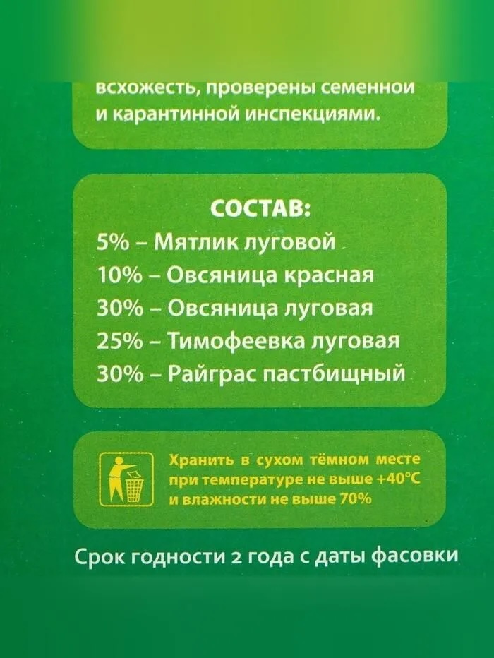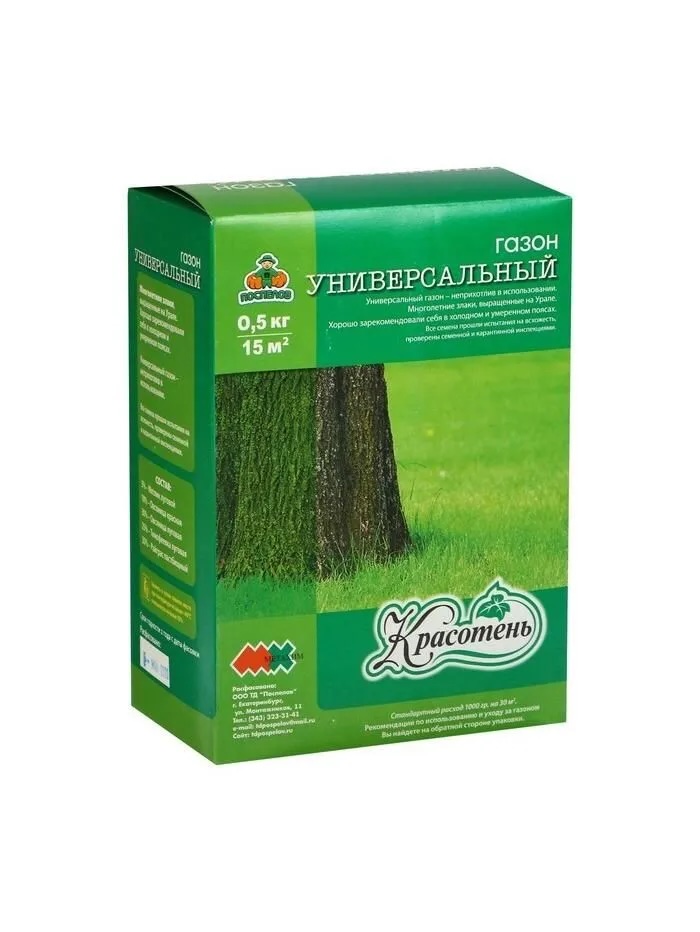Универсальный газон - не прихотлив в использовании. Многолетние злаки, выращенные на Урале. Хорошо зарекомендовали себя в холодном и умеренном поясах. Все семена прошли испытания на всхожесть, проверены семенной и карантинной инспекциями. Стандартный расход: 1000 гр. на 30 м2Рекомендации:1. 3а неделю до высева семян, для лучшего роста и окраски травы, можно внести в почву специальные удобрения для газонов (компания Метахим-Агро производит удобрение УКЦ для газонов и цветников). Проводя граблями по поверхности почвы смешать удобрения с грунтом. Затем обильно полить. 2. В день посева взрыхлите поверхность почвы граблями так, чтобы остались мелкие прямые бороздки. 3. Отмерьте необходимо количество семян из расчёта 35 г. на 1 м2. 4. Аккуратно перемешайте семена плоской стороной граблей с верхним слоем почвы или слегка присыпьте тонким слоем (не более 1 см)5. Можно плотно прижать семена к почве при помощи ручного катка или ногами. 6. Обильно полейте газон с помощью дождевателя или рассеивателя воды. Напоминаем: * Помните - молодая трава очень чувствительна к пересыханию и нужно заботиться о её регулярном увлажнении летом. * Лучшее время для посева травы - начало или середина сентября. Также подходящее время - конец апреля-май. * Для нормального роста, укоренения и цветонасыщенности травы используйте специальные удобрения для газонов и цветников. * Для полива трав рекомендуется к использованию жидкое органо-минеральное удобрение серии Уральский посад для газонной травы. Хранение: Рекомендуем хранить в сухом тёмном месте при температуре не выше +40С и влажности не выше 70%.