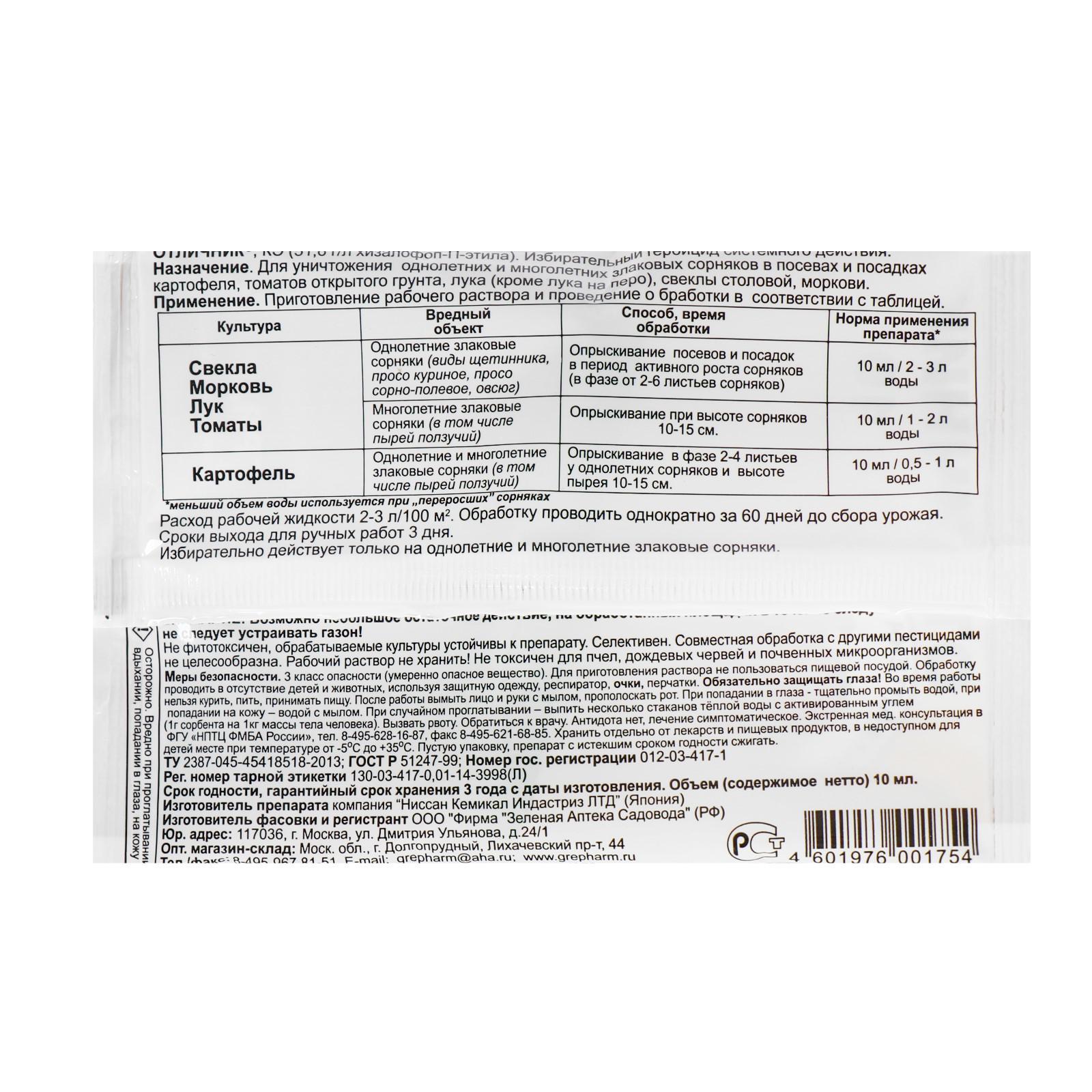 Средство применяется для уничтожения однолетних (щетинники, просо куриное и другие) и многолетних злаковых сорняков, в частности пырея ползучего, в посевах и посадках картофеля, томатов, лука, свёклы и моркови. Как применять: опрыскивать грядки в период активного роста сорняков, в фазе от 2–6 листьев до кущения и при высоте пырея ползучего 10–15 см. Действие и результат Средство эффективно только против однолетних и многолетних злаковых сорняков. Спустя 5–7 дней листья желтеют, через 10–15 дней сорняки погибают. Препарат сохраняется в почве 30 дней и препятствует прорастанию сорняков из семян. За это время успевают сформироваться и вырасти культурные растения, и рост молодых сорняков для них уже неопасен. Действие на многолетние сорняки сохраняется до конца вегетационного периода. Безопасность и экологичность Средство неопасно для пчёл, дождевых червей и почвенных микроорганизмов. Относится к классу 3 (умеренно опасное вещество). Не действует на защищаемые культуры. Опасно для злаковых растений — не допускать попадания на газоны!