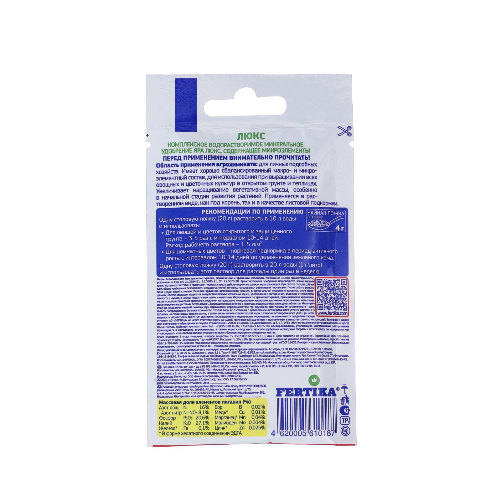 «Fertika Люкс» — это комплексное мелкокристаллическое, полностью водорастворимое удобрение. Оно предназначено для подкормок всех комнатных растений, овощных культур, цветов и рассады. Характеристики содержит все необходимые микро- и макроэлементы в оптимальном соотношении; стимулирует бутоно- и плодообразование; удлиняет период цветения; повышает интенсивность окраски цветков и листьев; Способы внесения Для комнатных растений 1 ст. ложку удобрения растворите в 10 л воды и применяйте летом при каждом поливе, а зимой через 3–4 раза. При выращивании рассады 1 ст. ложку средства разведите в 20 л жидкости и поливайте 1 раз в неделю. Для овощных культур и цветов В закрытом грунте: 1 ст. ложку средства разведите в 20 л воды и поливайте 1 раз в неделю. В открытом грунте: 1 ст. ложку удобрения растворите в 20 л жидкости и орошайте 1 раз в 2 недели.