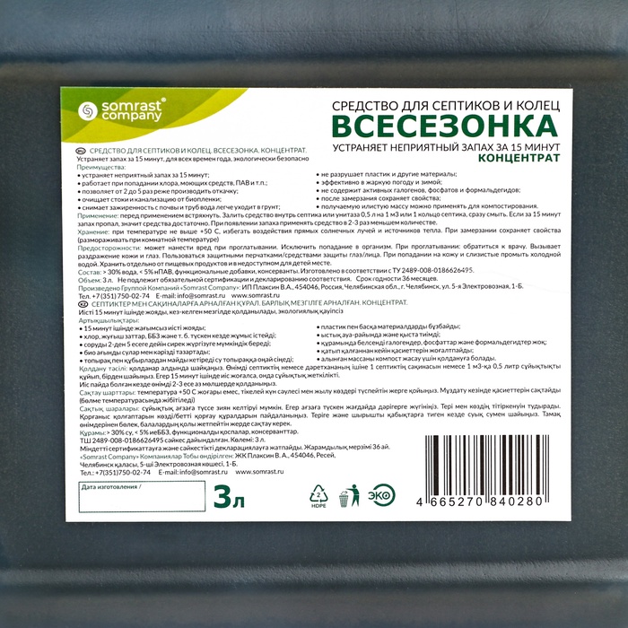 Средство для септиков и колец «Всесезонка» устраняет неприятные запахи всего за 15 минут. Преимущества препарата: снижает жирность почвы и труб, благодаря чему вода свободно уходит в грунт; работает при попадании хлора, моющих средств и ПАВ; позволяет откачивать септик намного реже; одинаково эффективно работает в жаркую погоду и зимой; не содержит активных галогенов, фосфатов и формальдегидов; сохраняет свои свойства после замерзания.