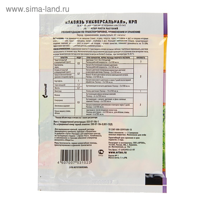 Стимулирует образование завязей и их рост при неблагоприятных погодных условиях и отсутствии опыляющих насекомых. Предотвращает опадение цветков и молодых завязей. Сокращает сроки созревания на 5-7 дней. Увеличивает ранний общий урожай на 15-30%. Обеспечивает повышение качества продукции.