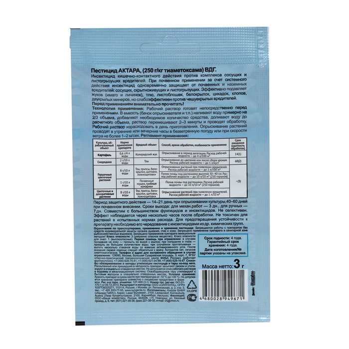 АКТАРА, ВДГ — инсектицид кишечно-контактного действия, предназначен для защиты: картофеля — от проволочника и наземных вредителей; капусты — от капустной мухи; гороха — от тли, зерновки; овощных и цветочных культур закрытого и открытого грунта — от тли, белокрылки, трипсов, щитовок и ложнощитовок; винограда и яблони — от медяниц, цикадок, цветоеда.