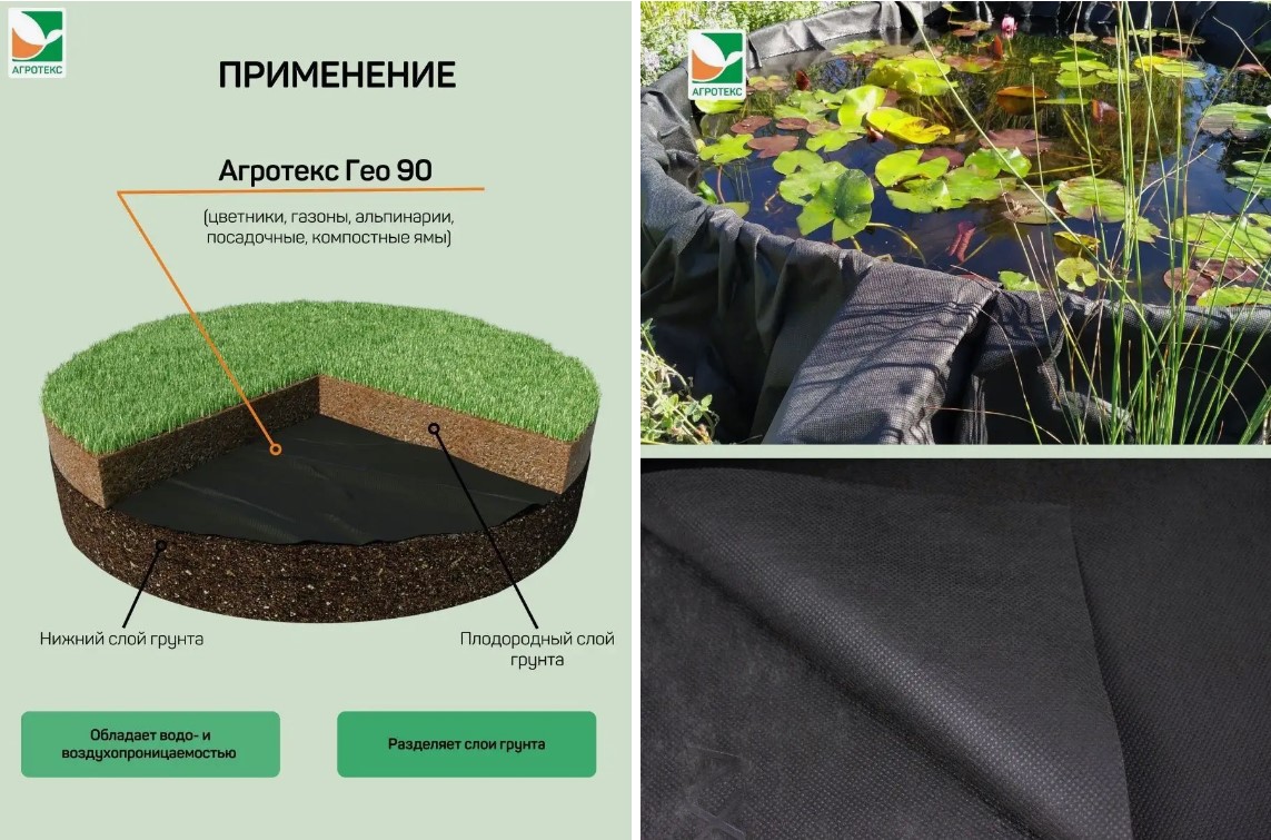 Нетканый материал для ландшафтных работ «Агротекс Гео 90 УФ» предназначен для обустройства различных элементов ландшафта: цветников; газонов; альпинариев; посадочных ям; компостных ям; садовых дорожек; облегчённых парковок. Также материал используют для разделения слоёв грунта, защиты гравия, почвы и песка от смешивания, проседания и размывания. Кроме того, «Агротекс Гео УФ» подходит для мульчирования хвойных и декоративных растений.