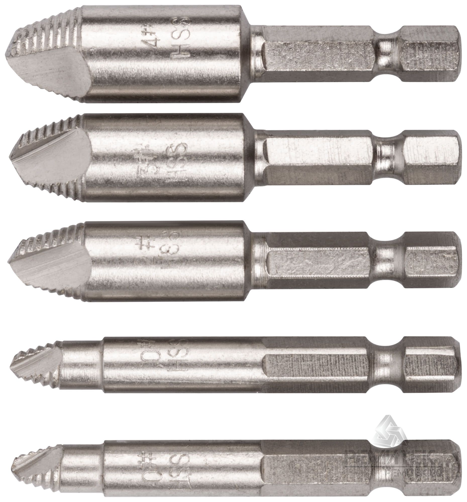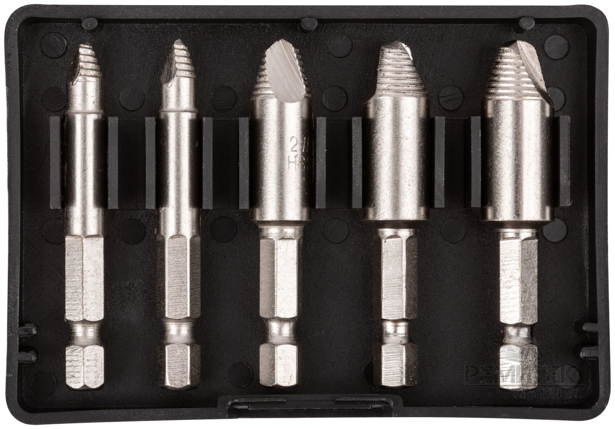 Экстракторы для болтов и шпилек усиленные из HSS-стали (комплект из 5 шт.) предназначены для демонтажа повреждённых шпилек и болтов с правой резьбой (с классом прочности не более 8,8). Оснащены шестигранным хвостиком для надёжного и удобного крепления в патроне дрели или шуруповёрта.