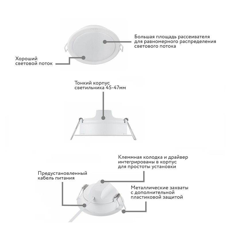 ветодиодный светильник Philips SmartBright DN027B G3 D150RD LED12/NW 12W 1300lm - это отличный выбор для тех, кто ценит качество и эффективность. Этот светильник обеспечивает яркое и равномерное освещение без слепящего эффекта и имеет долгий срок службы. Благодаря своей конструкции, он легко монтируется и идеально подходит для использования в жилых и коммерческих помещениях. Светильники встраиваемые серии SmartBright DN027B G3 от торговой марки PHILIPS - это бюджетное решение потолочного освещения без слепящего эффекта и видимой пульсации. Легкий, компактный и простой в установке светодиодный светильник, заменяющий традиционные светильники с компактными люминесцентными неинтегрированными лампами. Основные особенности и преимущества: - Компактный тонкий АЛЮМИНИЕВЫЙ корпус и небольшой вес обеспечивают простоту установки и безопасность эксплуатации - Интегрированный драйвер обеспечивает легкость подключения - Широкий выбор размеров – возможность установки в любой потолок, даже с самым узким запотолочным пространством - Без пульсации - Эффективность до 100 лм/Вт - Гарантия 3 года Области применения: - Светильник встраиваемый для натяжного или гипсокартонного потолка - Потолочное освещение - Общее освещение - Общественные зоны - Лестничные пролеты - Коридоры - Фойе - Магазины - Прямая замена светильников с галогенными лампами и КЛЛ Особенности продукта: - Тип защиты: IP20/40 - Диаметр необходимого выреза в потолке: 150 мм Товар сертифицирован.