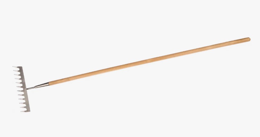 Грабли «Сибртех». Это стальные грабли длиной 1300 мм, с 12 витыми зубьями и шириной гребенки 300 мм. Назначение: уборка с газонов и грядок листвы и мусора, а также проведение аэрации почвы. Особенности: рабочая часть и тулейка изготовлены из конструкционной углеродистой стали, зубья утолщены, поэтому грабли выдерживают большие нагрузки; порошковое покрытие предотвращает появление коррозии, продлевая рабочий ресурс инструмента; зубья имеют витую конфигурацию, поэтому эффективно разбивают комья земли и обеспечивают насыщение почвы кислородом. Грабли поставляются в сборе с деревянным черенком, диаметр крепления — 30 мм, вес — 0,9 кг.