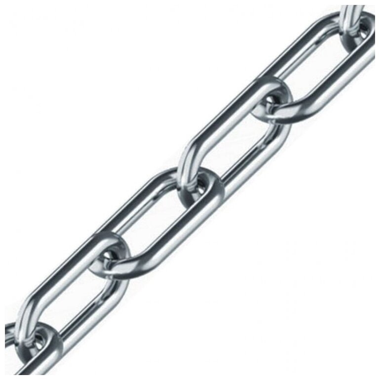 Цепь DIN 763 производится из стали с оцинкованным покрытием или из нержавеющей стали А2, А4. Звено цепи DIN 763 имеет удлинённую форму, за счет этого цепь легче чем короткозвенная. Концы звена свариваются. Стандартные диаметры звена цепи: D2 - D16. НЕ предназначена для поднятия тяжелых грузов.