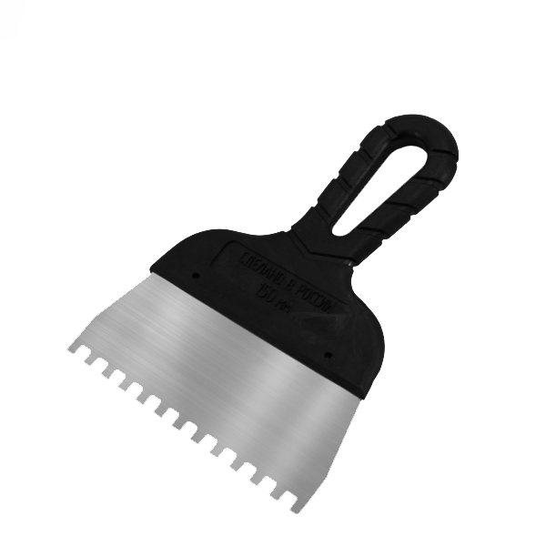 Благодаря зубчатой кромке шпатель идеально подходит для работы со строительными и клеевыми смесями, стальное полотно обеспечивает надежность инструмента, а удобная пластмассовая рукоятка создает условия для комфортной работы.
