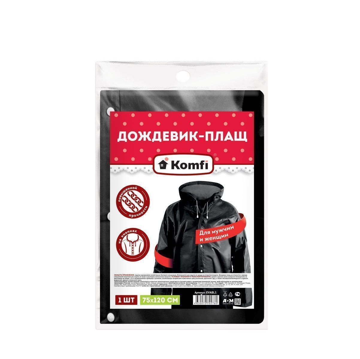 Дождевик плащ ЕВА (75х120 см) - многоразовый плотный плащ на кнопках. Дождевик прочный и идеально подойдет для отдыха на природе, туристических походов, рыбалки, пикника. Непромокаемый плащ идеален и для городских прогулок. Дождевик водонепроницаемый, т.к. произведен методом горячей пайки из водонепроницаемого и экологически чистого материала EVA. Материал EVA не вызывает аллергических реакций и эластичнее, легче полиэтилена. В сложенном виде, плотный плащ дождевик будет компактен в Вашей сумке. Имеет свободный фасон, что позволяет надеть дождевик поверх практически любой одежды.