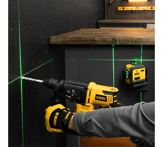 Проецирует 2 взаимно перпендикулярные линии с охватом в 360° на расстояние до 30 м при помощи зелёных лучей длиной 520 нм.