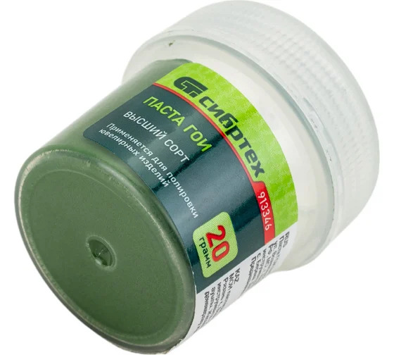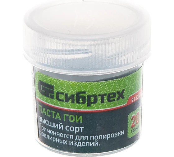 Паста ГОИ №3 Сибртех 913346, 20 гр. в банке, используется как для ручной полировки тканью, так и для машинной с помощью дрели или шлифмашины со специальной насадкой. Универсальная паста подходит для работы с ювелирными изделиями, металлом, пластиком и стеклом. Благодаря ей можно защитить поверхности от механических повреждений, исправить косметические дефекты и придать им зеркальный блеск.