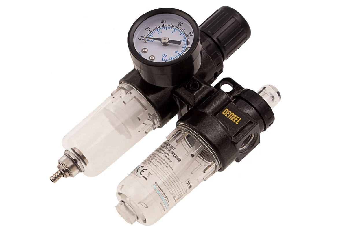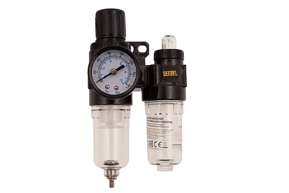 Блок подготовки воздуха регулятор-фильтр-лубрикатор FLR1500, 10 бар, 1500 л/мин, 1/4 Denzel 57469 с максимальной пропускной способностью 1500 л/мин, присоединительным размером 1/4 дюйма, предназначен для работы под давлением не более 10 бар. Используется для очистки сжатого воздуха от воды и вредных примесей, твердых частиц размером до 40 мкм, для подачи в воздух смазки для пневмоинструмента. Позволяет регулировать и поддерживать на заданном уровне давление в пневматических устройствах различного назначения. Устройство значительно увеличивает срок службы пневмоинструмента. Вместимость фильтра составляет 15 мл, лубрикатора — 25 мл.