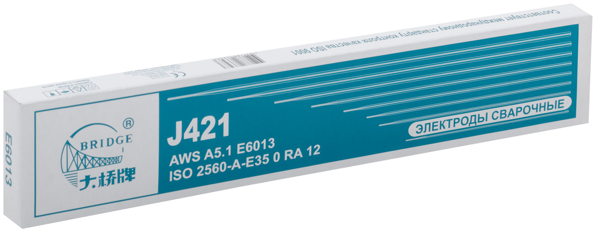 Электроды j421 "bridge" (аналог ОК46) для низкоуглеродистых сталей - сварочный электрод с рутиловым покрытием. Подходит как для переменного тока, так и для постоянного. Предназначен для ручной дуговой сварки конструкций из низкоуглеродистых конструкционных сталей, тонколистовой стали с коротким прерывистым сварным швом и сварки, которая требует плавного прохода. Сварка позиций: PA, PB, PC, PD, PE, PF. Электрод обладает отличными механическими и сварочными свойствами, обеспечивает устойчивую дугу, минимум брызг при сварке и улучшенное шлакоотделение. При производстве данных электродов используется улучшенное сырье, за счет чего электрод легче плавится и минимизируется количество пор в соединении. Обмазка синего цвета характеризуется меньшим вредом для окружающих и самого сварщика, легко поддаётся повторному зажиганию и позволяет сваривать даже плохо подготовленный металл.