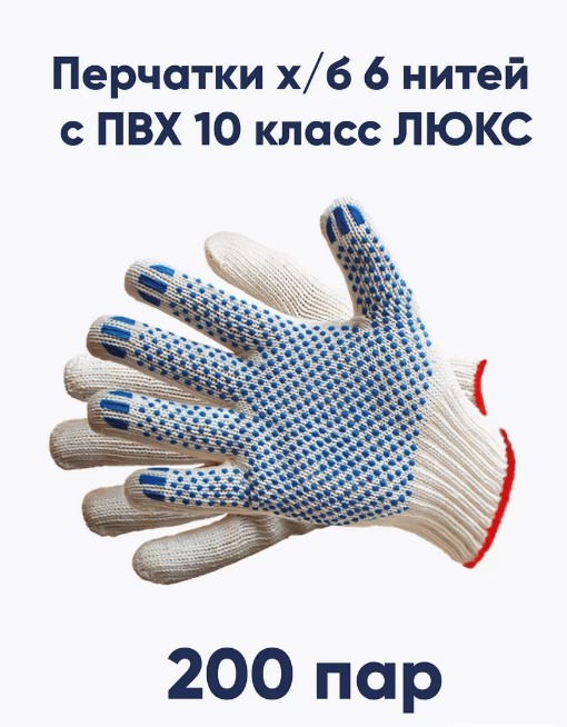 Перчатки х/б с ПВХ-покрытием 10-го класса, 6-ниточные, с рисунком «точка» (упаковка 200 пар) предназначены для защиты рук от общих производственных загрязнений. Такие перчатки подходят для разных видов работ, в том числе: складских; садовых; ремонтных; использования в автомобиле для защиты рук от травм и грязи. Также такие перчатки могут использоваться для работы с гладкими, скользкими покрытиями, погрузки и разгрузки, фасовки товара, ремонта и обслуживания техники и в других сферах.
