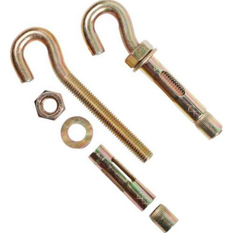 Анкерный болт с крюком используется для вывешивания тяжеловесных съемных конструкций или временного крепления такелажных изделий, таких как тросы, цепи и др. к бетону, кирпичу или природному камню.