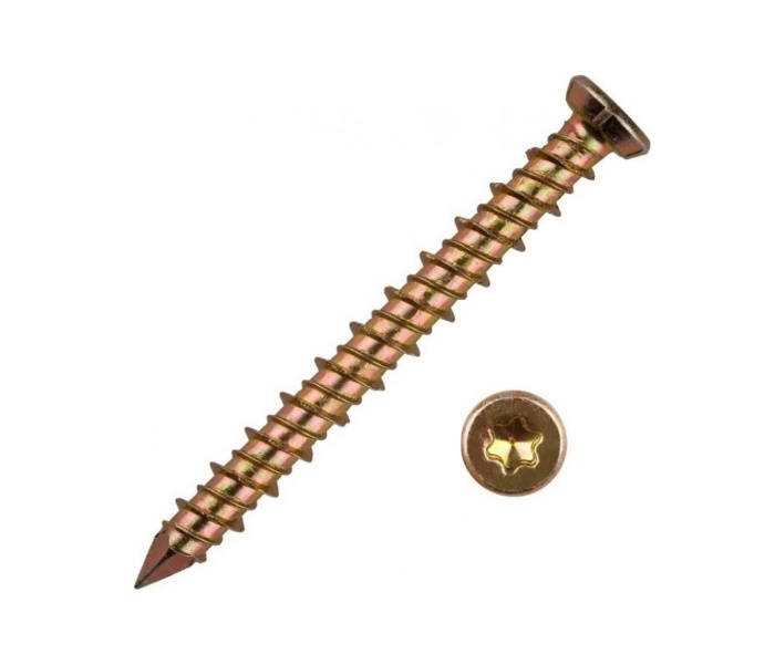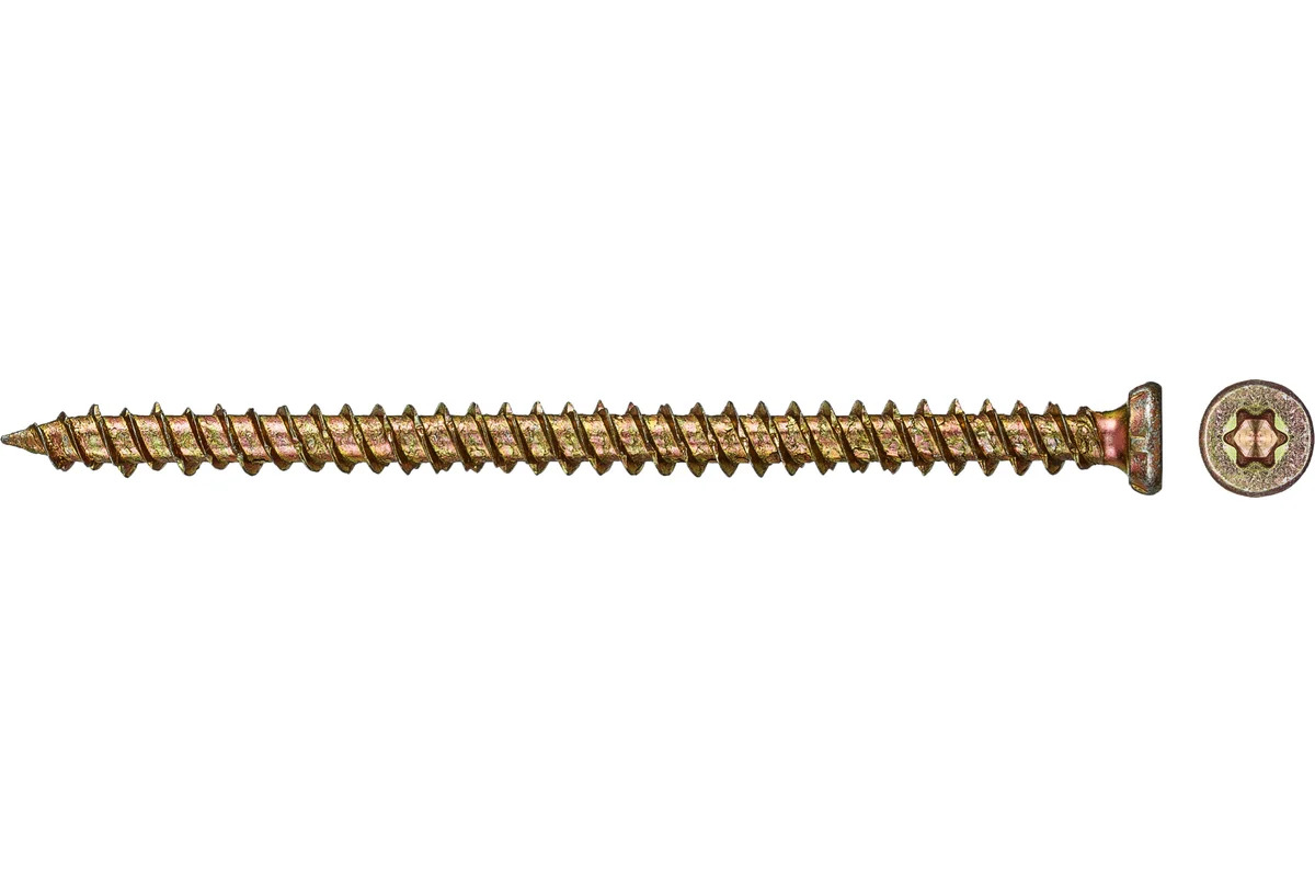 Шуруп по бетону 7.5х112 мм — это стальной крепеж с жёлтым цинковым покрытием, который используется для крепления конструкций к бетонным и кирпичным поверхностям. Он имеет двухзаходную резьбу, острый наконечник и потайную головку с насечками для раззенковки. Оцинкованный шуруп по бетону применяется для крепления различных предметов к бетонным основаниям, таким как оконные рамы, дверные коробки, бытовая техника и другие предметы интерьера. Шуруп по бетону может выдерживать достаточно большие нагрузки в зависимости от его размера и диаметра. Оцинкованный шуруп по бетону может работать в любых погодных условиях, так как он защищён от коррозии благодаря слою цинка. Средний срок службы оцинкованного шурупа по бетону составляет около 50 лет.