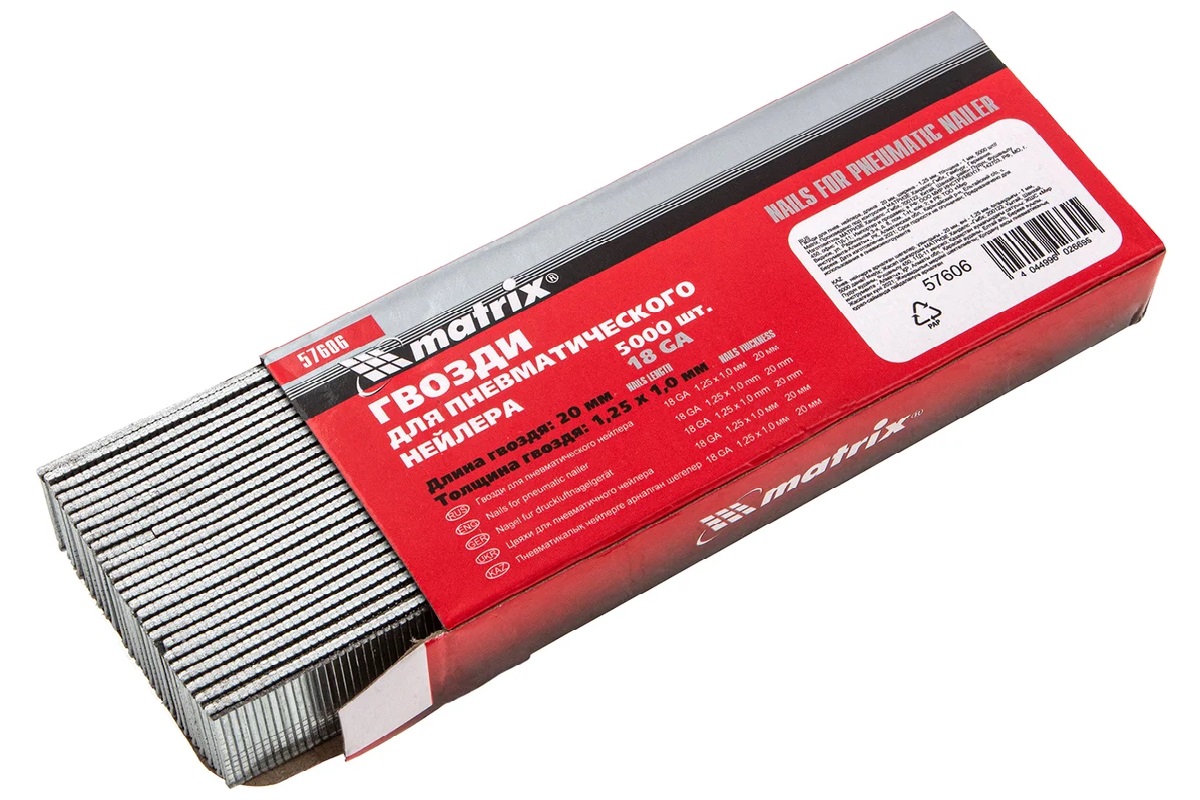 Гвозди Matrix 57606, тип 18GA, предназначены для работы с пневматическим нейлером любой торговой марки. Длина 20 мм и ширина 1,25 мм обеспечивают быстрое и надежное скрепление деревянных деталей, монтаж уголков, металлических полос и выполнение других бытовых задач.