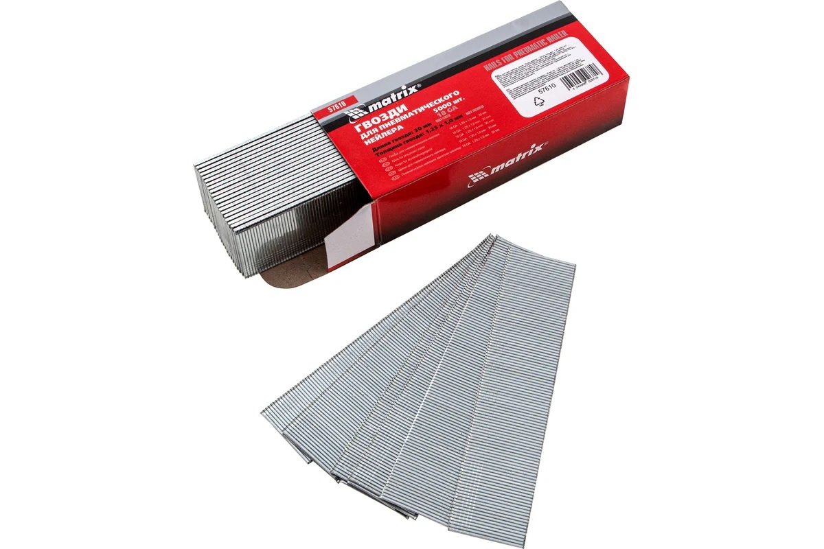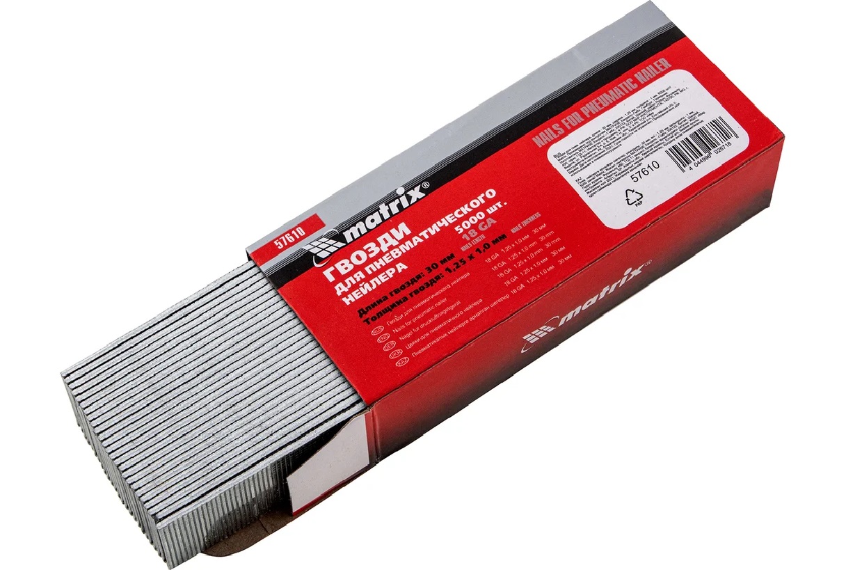 Гвозди Matrix 57610, тип 18GA, предназначены для работы с пневматическим нейлером любой торговой марки. Длина 30 мм и ширина 1,25 мм обеспечивают быстрое и надежное скрепление деревянных деталей, монтаж уголков, металлических полос и выполнение других бытовых задач.