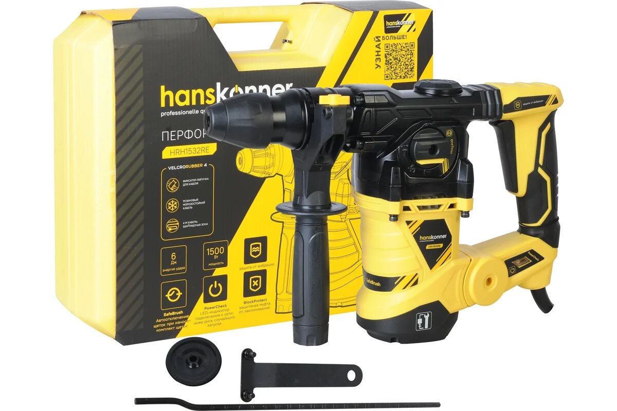 Hanskonner HRH1532RE — профессиональный перфоратор с функциями удара, сверления и сверления с ударом, а также режимом установки долота в любых угловых положениях.