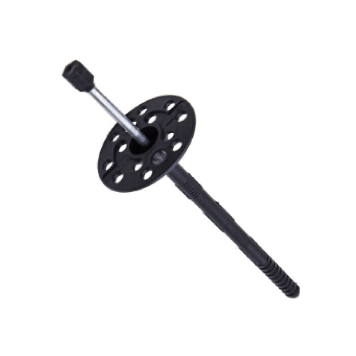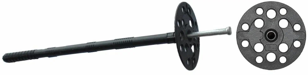 Дюбель для крепления теплоизоляции с металлическим гвоздем и термоголовкой применяется для крепления теплоизоляционных материалов к бетону, полнотелому и пустотелому кирпичу, камню, пенобетону. Состоит из дюбеля с двухсегментной распорной частью, имеющего увеличенную прижимную шайбу диаметром 60 мм и стального гвоздя с термоголовкой, предотвращающей образование такого явления как «мостик холода». Установка производится методом сквозного монтажа.