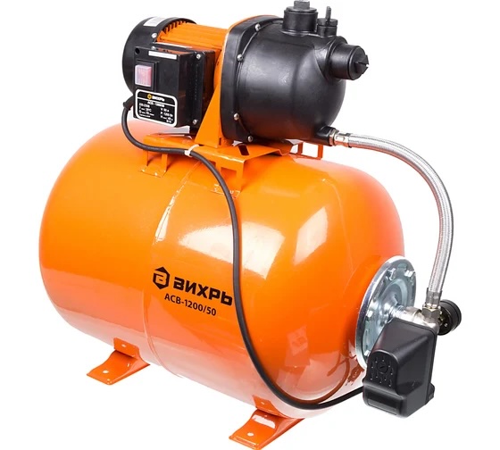 Модель мощной автономной станции водоснабжения Вихрь АСВ 1200/50 состоит из поверхностного электронасоса, гидроаккумулятора и реле давления, объединённых в единую конструкцию. Мощность насоса составляет 1.2 кВт. Объём гидроаккумулятора – 50л. Станция способна перекачивать до 70 л/ч, создавая напор до 40м. Напор в системе поддерживается автоматически. При понижении давления до 1.5 бар реле включает агрегат, а при повышении до 3.0 бар – выключает. Модель Вихрь АСВ 1200/50 рассчитана на 20 включений в час. Температура перекачиваемой воды может быть в пределах +1 - +50°С при концентрации твёрдых частиц до 150 г/м³. Электропитание автономной насосной станции осуществляется от сети 220 В, 50 Гц с допустимыми колебаниями напряжения до 10%. Модель Вихрь АСВ-1200/50 может обеспечивать снабжение водой до четырех открытых водозаборных точек, при заборе с глубины до 5м и при длине магистрали до 5м. При заборе с глубины до 6м и при длине магистрали до 5м станция обеспечит водоснабжение до трех открытых водозаборных точек. При заборе с глубины до 7м и при длине магистрали до 5м станция обеспечит водоснабжение до двух одновременно открытых точек. Внимание. Работа станции без воды запрещена.